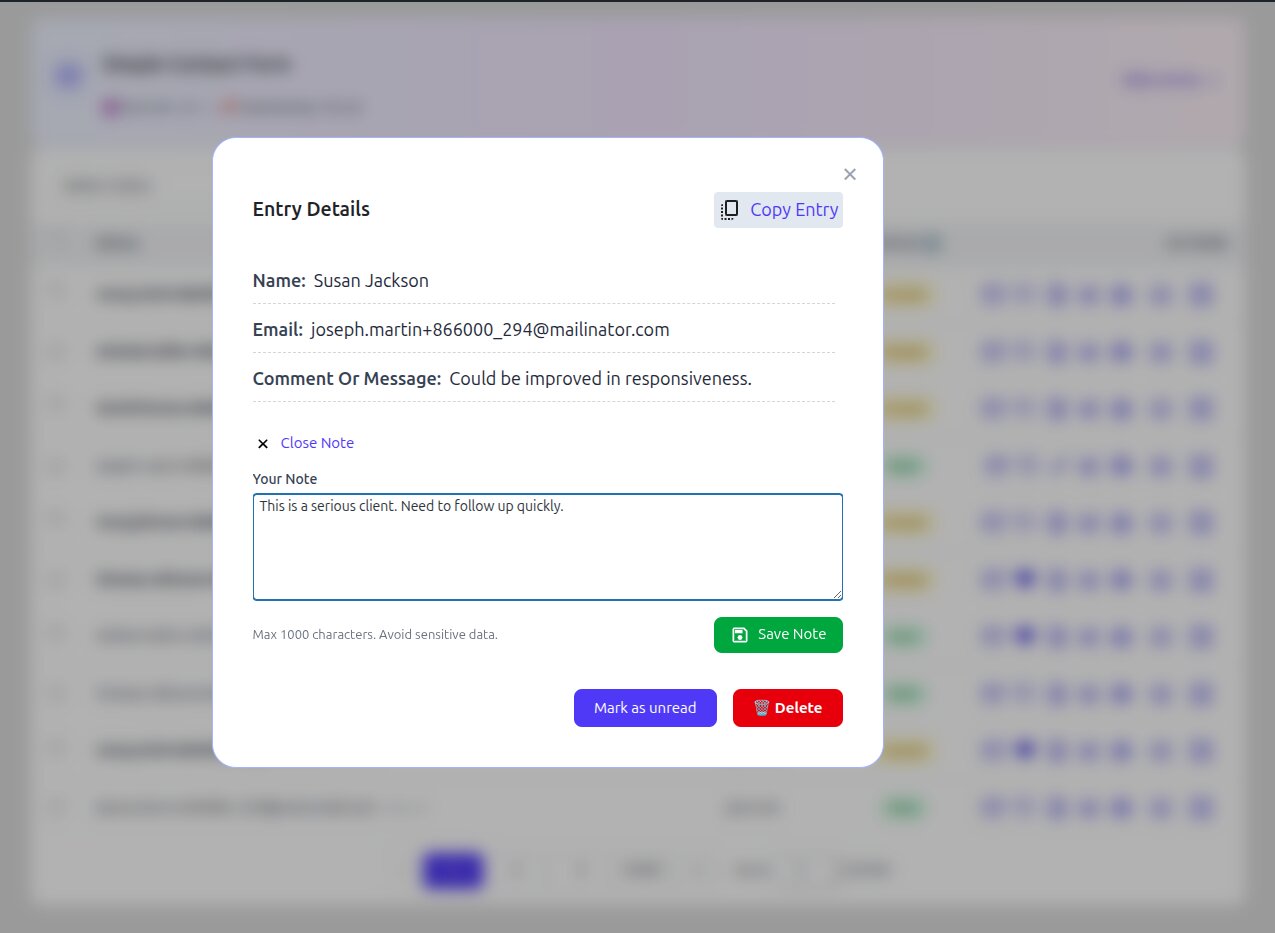 Say goodbye to disorganized emails and fragmented data. Our Entry Listing feature gives you a clean, centralized view of every single one of your form submissions with easy-to-use pagination. When you need to inspect the details, our elegant Modal View displays all the information from a specific entry in a clean, readable pop-up.